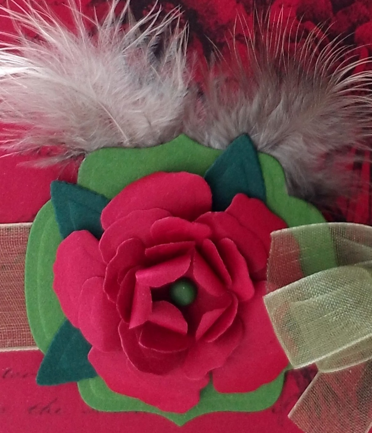 Here's what I used: Spellbinders Rose Creations and Labels Nine Die-Cuts; organza ribbon, feathers, ivory card base, olive green cardstock, and burgundy patterned/stamped cardstock (I don't know where I got this...I just found it in my stash).