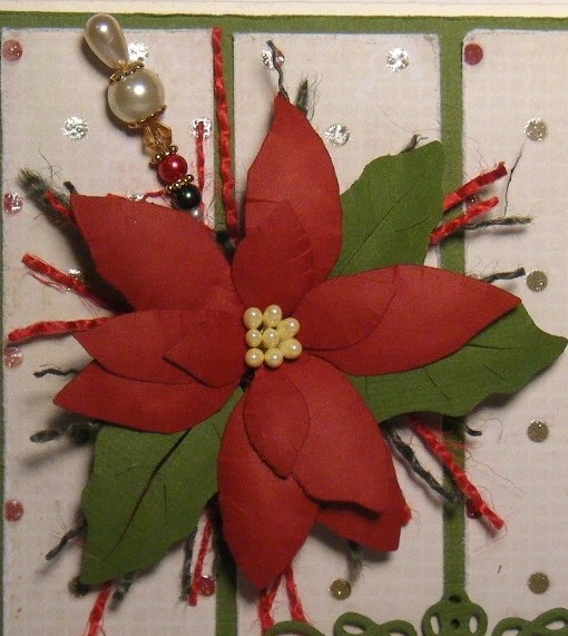 The sentiments are from Holly Juniper - front and Holiday Greetings-inside (both from Doodle Pantry). The poinsettia flower is a die cut by Cuttlebug. I added a few yellow stamen pearls to the center rather than the paper one that comes with the die cut. The decorative mat for the front sentiment is a die cut by Whimsy Stamps. The stick pin is handmade and I added a bit of red and green burlap strings under the flower.